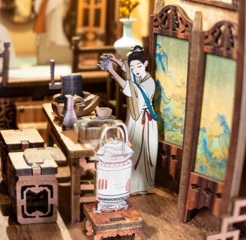 Dans la quiétude d’un intérieur boisé, baigné d’une lumière tamisée, Elegant Song Dynasty murmure l’art de vivre d’une époque raffinée. Ici, une musicienne fait danser les cordes de son pipa, pendant qu’un hôte prépare le thé avec lenteur. Chaque pilier, chaque panneau sculpté, chaque tasse posée raconte la douceur d’un monde où la beauté réside dans les détails.