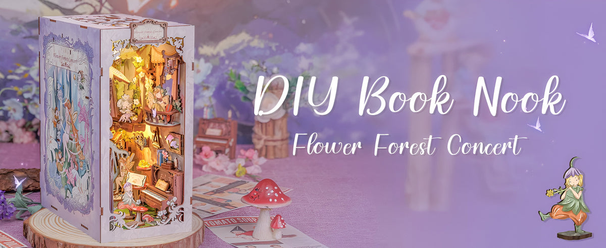 Sous la canopée d’une forêt en fleurs, des fées aux ailes translucides prennent place sur une scène délicate. Harpe, piano et instruments enchantés résonnent sous les arches végétales, tandis que les pétales et les lanternes suspendues forment un écrin de lumière. Chaque recoin de ce book nook raconte une mélodie silencieuse, un concert miniature où la magie se mêle à la nature.