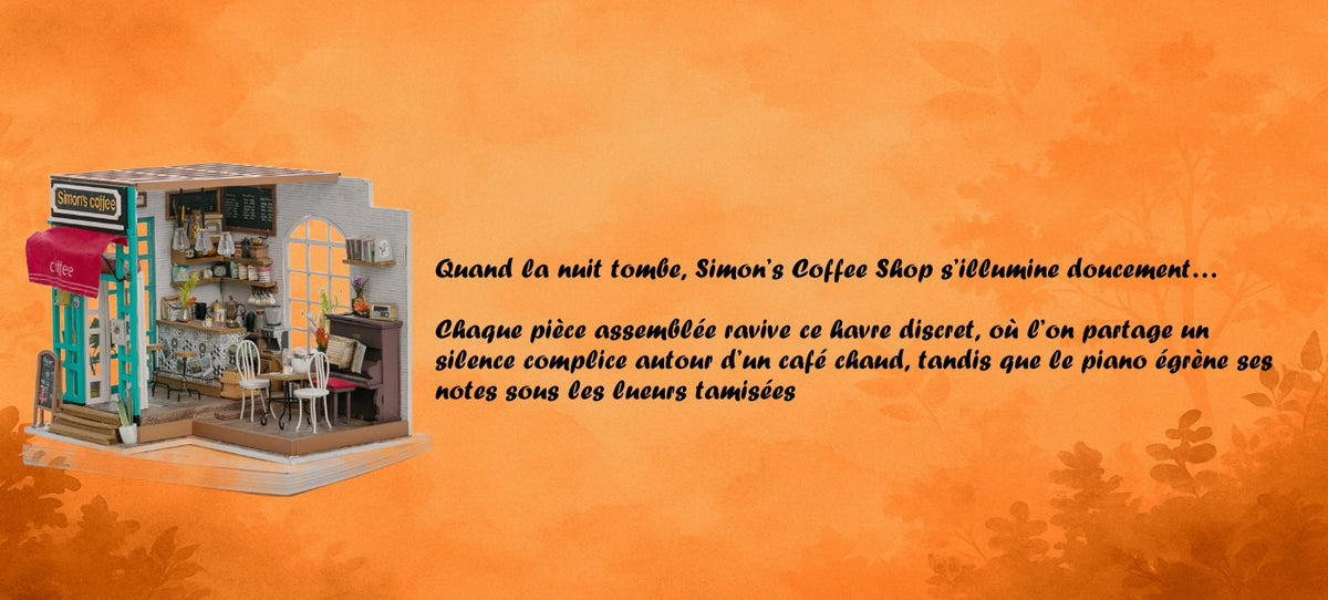 Le Simon’s Coffee Shop de Rolife recrée, pièce après pièce, l’ambiance chaleureuse d’un bistrot de quartier où il fait bon s’attarder. Dans ce petit coin à assembler, le parfum du café semble flotter dans l’air, même en bois et en papier. Les tables attendent leur client imaginaire, et les tasses prêtes à raconter mille histoires. Chaque élément – machine à café, comptoir, tabourets, étagères chargées de douceurs – invite à une pause pleine de charme, baignée d’un éclairage LED doux qui fait briller la scène une fois la nuit tombée. Un cadeau original et délicat, idéal pour les amateurs de café, de miniatures ou d’univers cosy… ou tout simplement pour s’offrir un instant suspendu, loin du tumulte du quotidien.