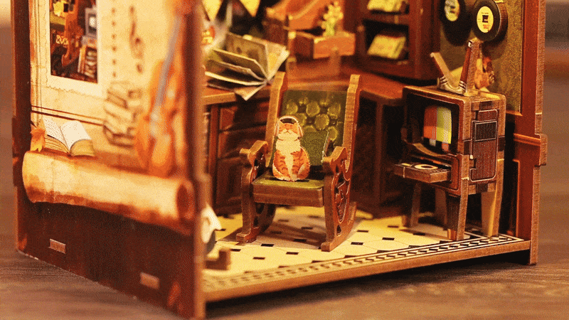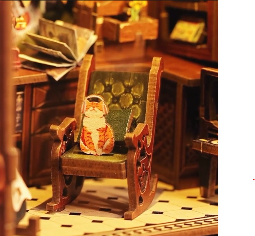 Un lieu miniature où les livres et la musique s’accordent en parfaite harmonie. Entre étagères murales, vinyles exposés et instruments suspendus, cette scène poétique évoque l’ambiance feutrée d’une boutique d’un autre temps. Chaque détail invite à la rêverie : un chat mélomane dans un rocking chair, une guitare posée là comme un écho d’une mélodie en suspens… Un décor à construire soi-même, pour savourer chaque instant de calme et de créativité.