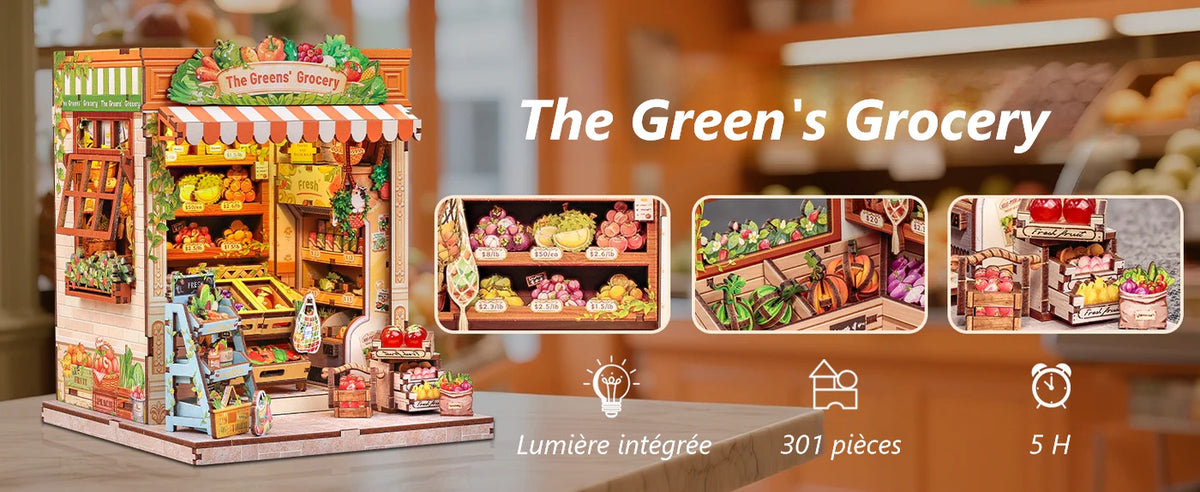 The Greens’ Grocery est une maison miniature à assembler soi-même, inspirée des petites épiceries de quartier où l’abondance des récoltes emplit chaque recoin. Ce kit DIY recrée une boutique chaleureuse baignée de lumière, où les pommes, potirons et tomates s’alignent dans des caisses en bois, prêtes à évoquer l’atmosphère vivante d’un marché matinal. Les étagères débordent de fruits et légumes multicolores, soigneusement disposés comme de véritables trésors naturels, tandis que des tiroirs remplis de raisins et de poivrons ajoutent une touche de douceur et de réalisme.